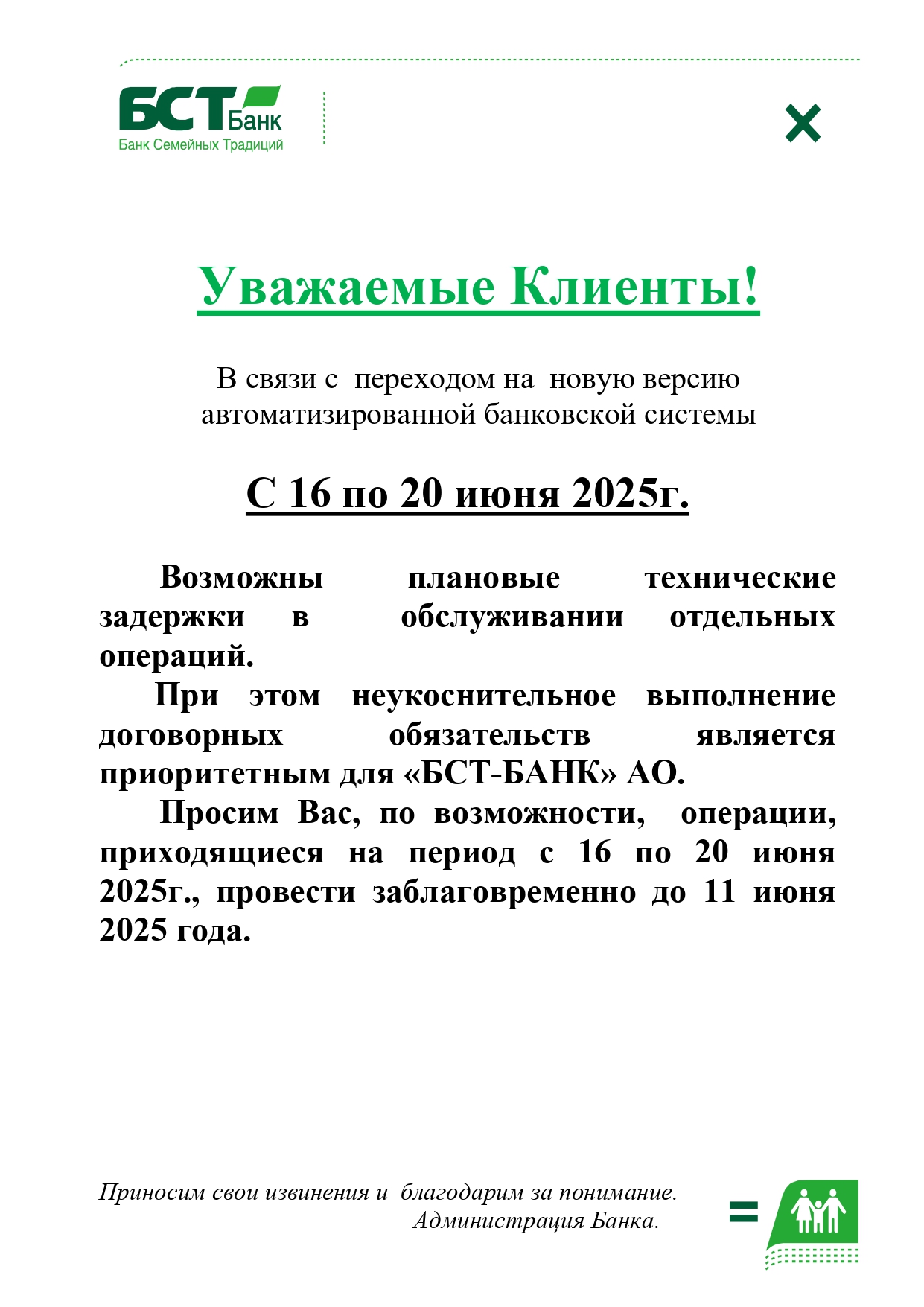 С 16 по 20 июня 2025г. возможны плановые задержки в обслуживании